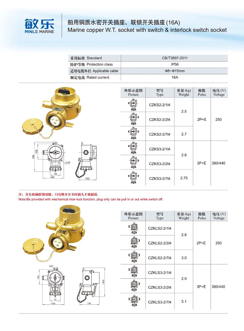 | 船用銅質(zhì)水密聯(lián)鎖開關(guān)插座(16A) | |||