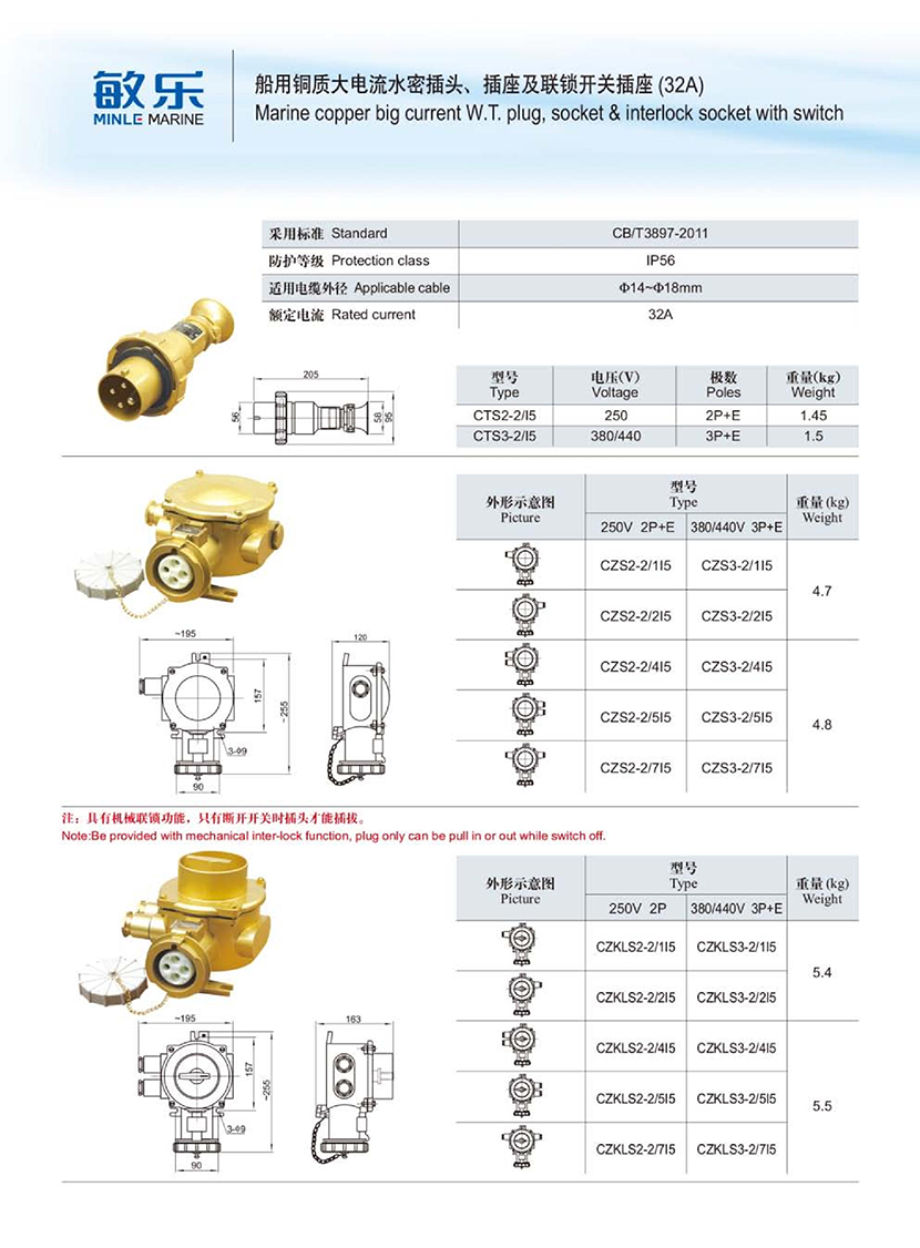 | 船用銅質(zhì)大電流水密聯(lián)鎖開(kāi)關(guān)插座(32A) | |||