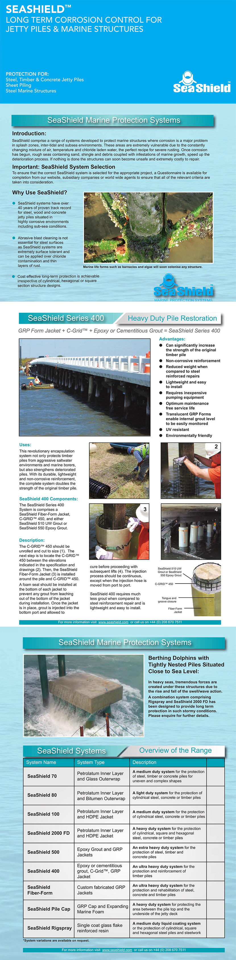 Can significantly increase the strength of the original timber pile; Non-corrosive reinforcement; Reduced weight when compared to steel reinforced repairs; Lightweight and easy to install; Requires inexpensive pumping equipment; Optimum maintenance free service life; Translucent GRP Forms enable internal grout level to be easily monitored; Environmentally friendly |
