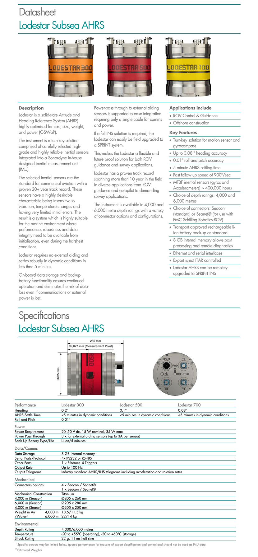 | 性能亮點: | An ideal replacement for your ship’s gyrocompass; Fast follow up speed of 900°/second; Fast settling time;A proven 20 year track record and MTBF of 400,000 hours+; Ensures continued operation and no data-loss even if communications or external power is lost; Cost effective; Upgradeable; OEM options available | ||